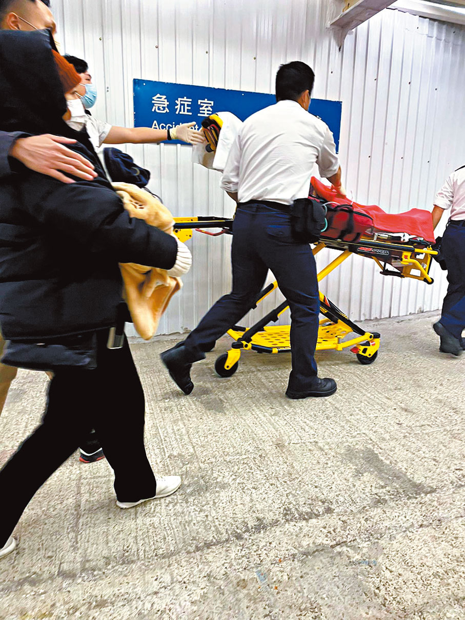 香港文匯報記者昨日下午到聯合醫院急診室採訪,直至傍晚時分,輪候求診的病人仍然絡繹不絕,目測現場有近百名病人輪候診症。記者在急症室內直擊只有幾名護士等工作人員在病人之間奔波忙碌,負責照顧病人、推送病人前往分流站、回應家屬查詢等。幾名救護員則推着急救擔架床頻密出入急診室運送病人,平均約10分鐘便有3名病人由「白車」送來。