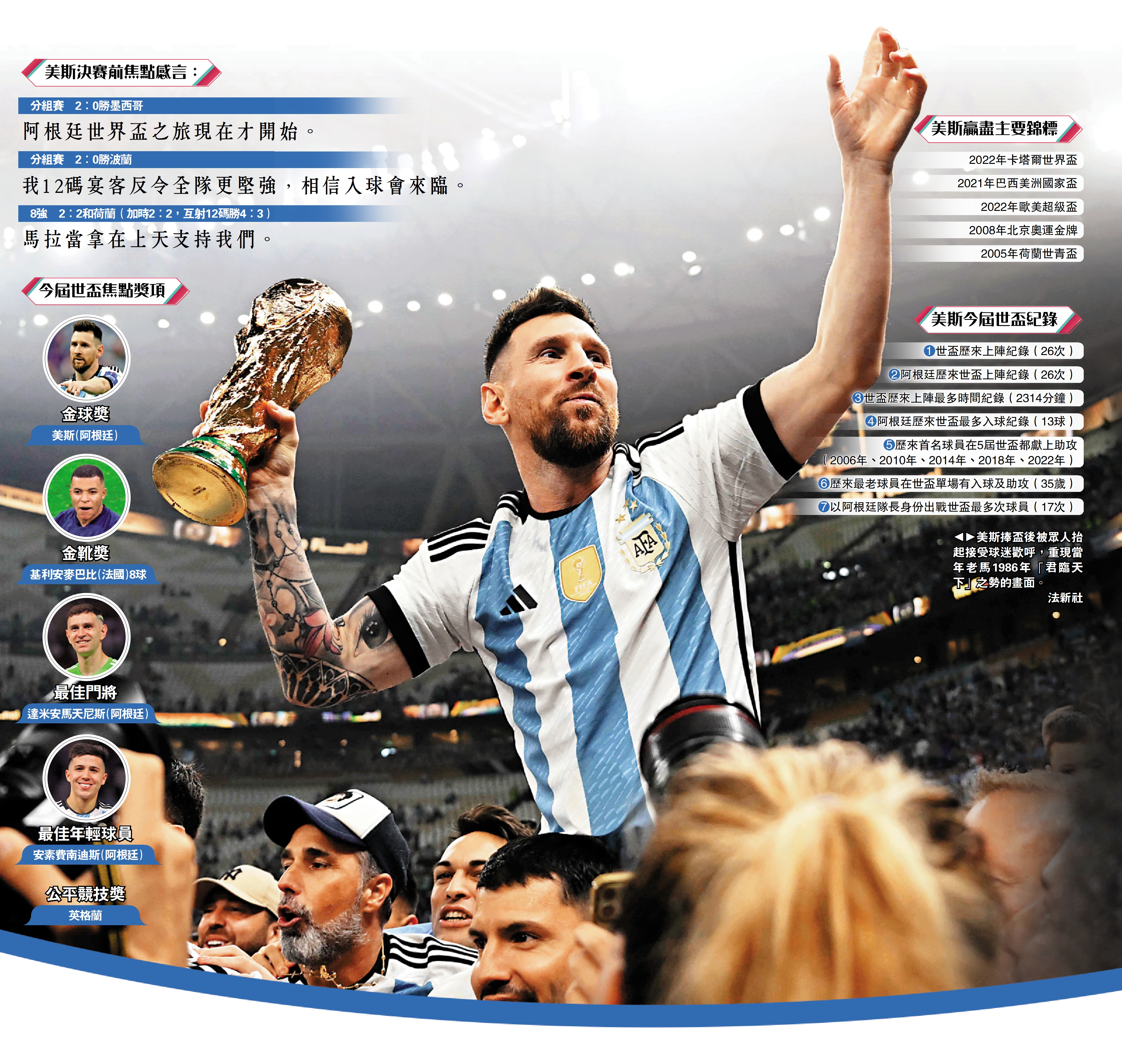 (大公報記者 譚德龍)經歷36年的奮鬥,阿根廷終於在美斯帶領下第3次奪取世界盃,整個過程以至決賽的戰情,亦甚有1986年馬拉當拿帶領阿根廷捧盃的影子,尤其捧盃後被眾人抬起接受球迷歡呼,重現當年老馬「君臨天下」之勢的畫面,彷彿美斯藉此與這名已故恩師的「隔世對話」。圓夢後的美斯仍未言休,表明將繼續踢國際賽,好好享受以世界盃冠軍的身份穿上阿根廷球衣。
