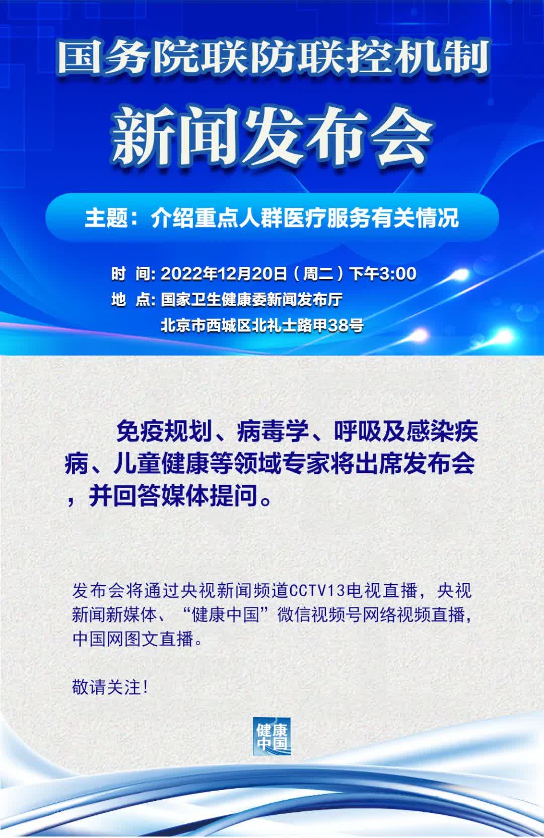 據微信公眾號「健康中國」消息,國務院聯防聯控機制將於12月20日下午3點舉行新聞發布會,介紹重點人群醫療服務有關情況。免疫規劃、病毒學、呼吸及感染疾病、兒童健康等領域專家將出席發布會,並回答媒體提問。