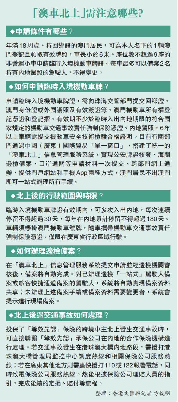「隨着全面放開澳門機動車經港珠澳大橋珠海公路口岸入出內地(簡稱『澳車北上』)政策實施,預計約8萬澳門私家車車主可享受這個政策紅利。」鄧正雨表示,「澳車北上」降低了申請門檻、簡化申辦手續,跨境通行也更便利。