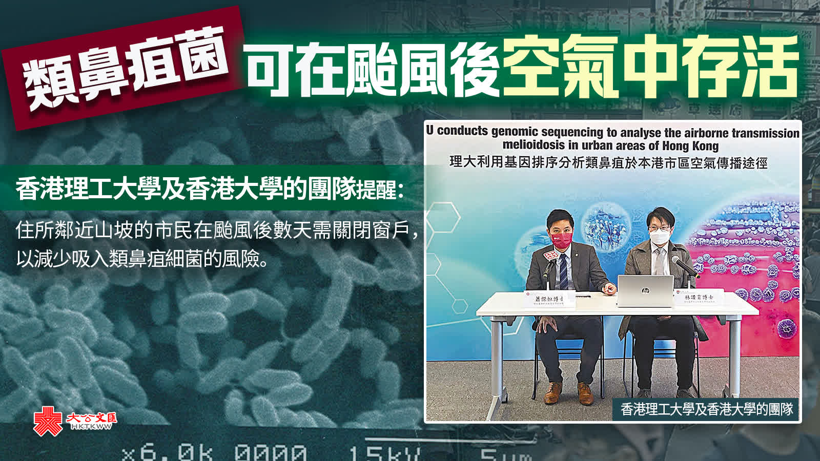 (香港文匯報 記者 郭倩)本港類鼻疽個案今年至今累積43宗,深水埗區出現的個案最多。香港理工大學及香港大學的團隊首次證實類鼻疽細菌在颱風後的空氣中存活,同時團隊發現白田邨及深水埗的確診個案是由一種首次在香港發現的菌株ST-1996所引致。團隊相信,今次類鼻疽疫情的傳播途徑是吸入性感染,但暫未能確定爆發的源頭,預計明年風季深水埗區仍可能爆發類鼻疽疫情,提醒住所鄰近山坡的市民在颱風後數天需關閉窗戶,以減少吸入類鼻疽細菌的風險。