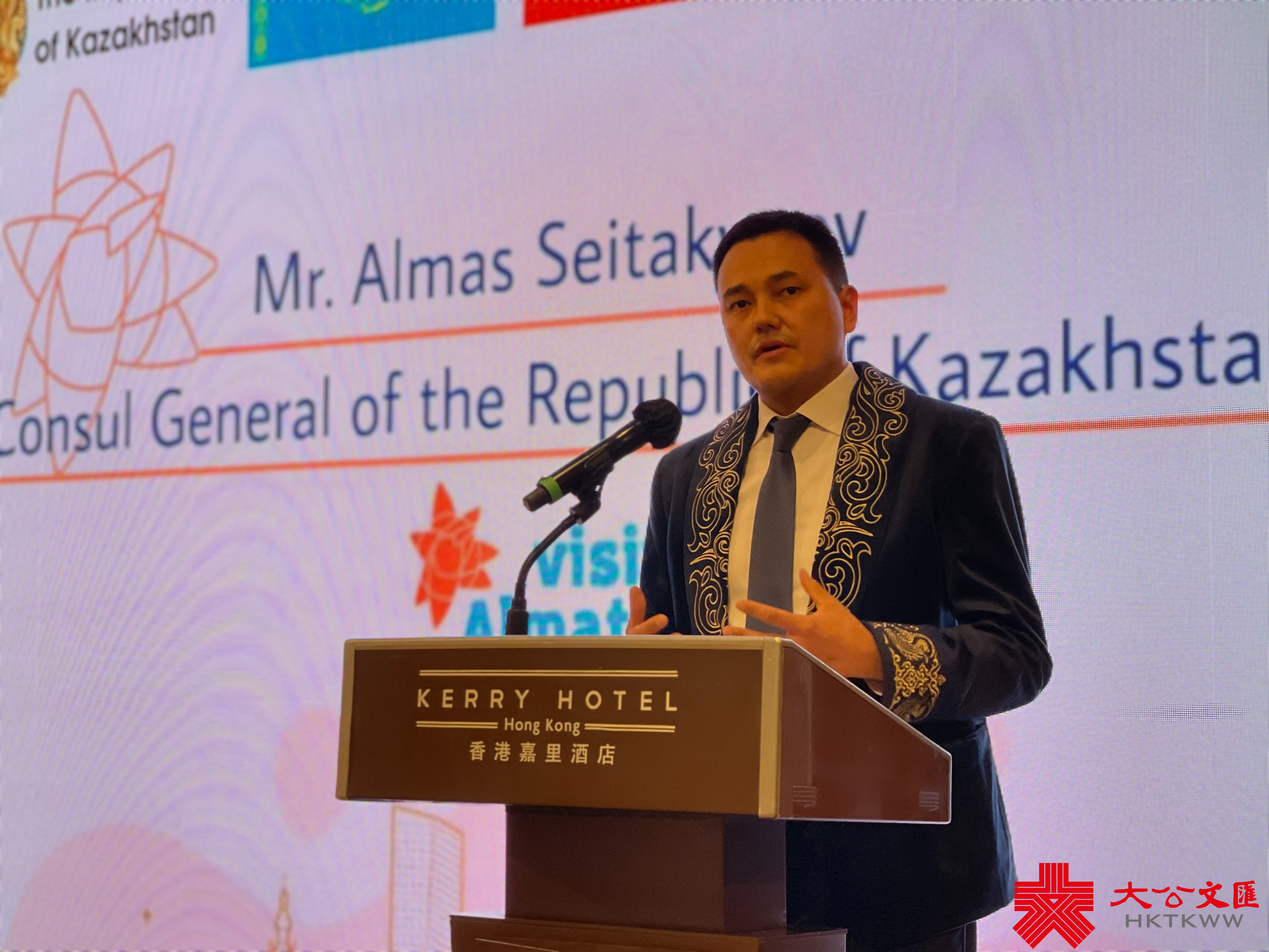 哈薩克斯坦駐港澳總領事阿爾馬斯•賽塔肯諾夫(Almas Seitakynov)向來賓介紹,哈薩克斯坦正在走出全球新冠疫情的陰霾,口罩已成為過去時。香港居民可免簽前往哈國旅遊,最長可逗留14日。