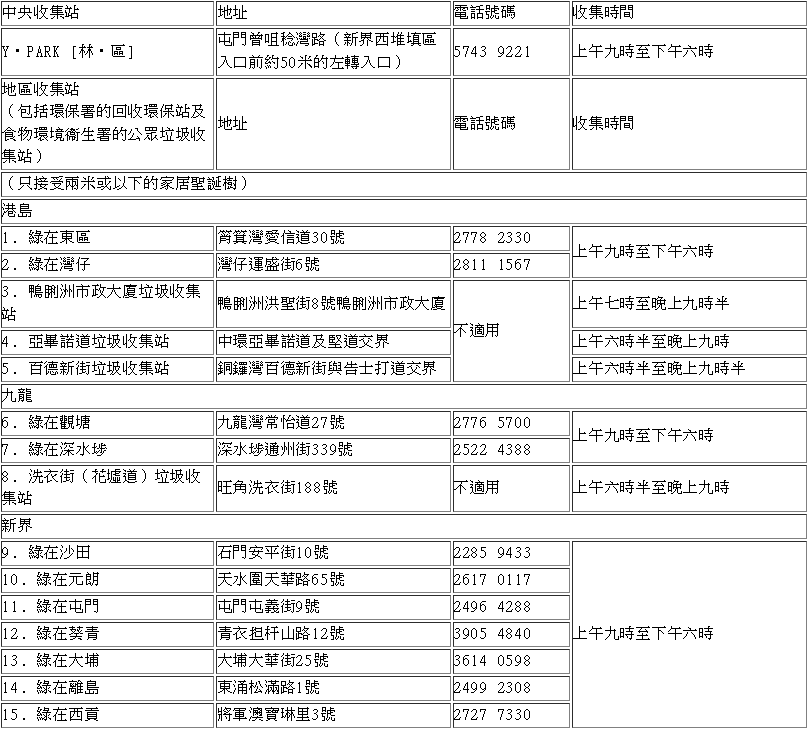 發言人表示,為方便市民參與聖誕樹回收計劃,今年的收集日期將由上年的4天延長至5天。回收得來的聖誕樹會在Y‧PARK [林·區]與其他園林廢物一同被轉化成不同再生產品,方便重用、循環再造或被升級再造成裝飾、木傢具或藝術品等。