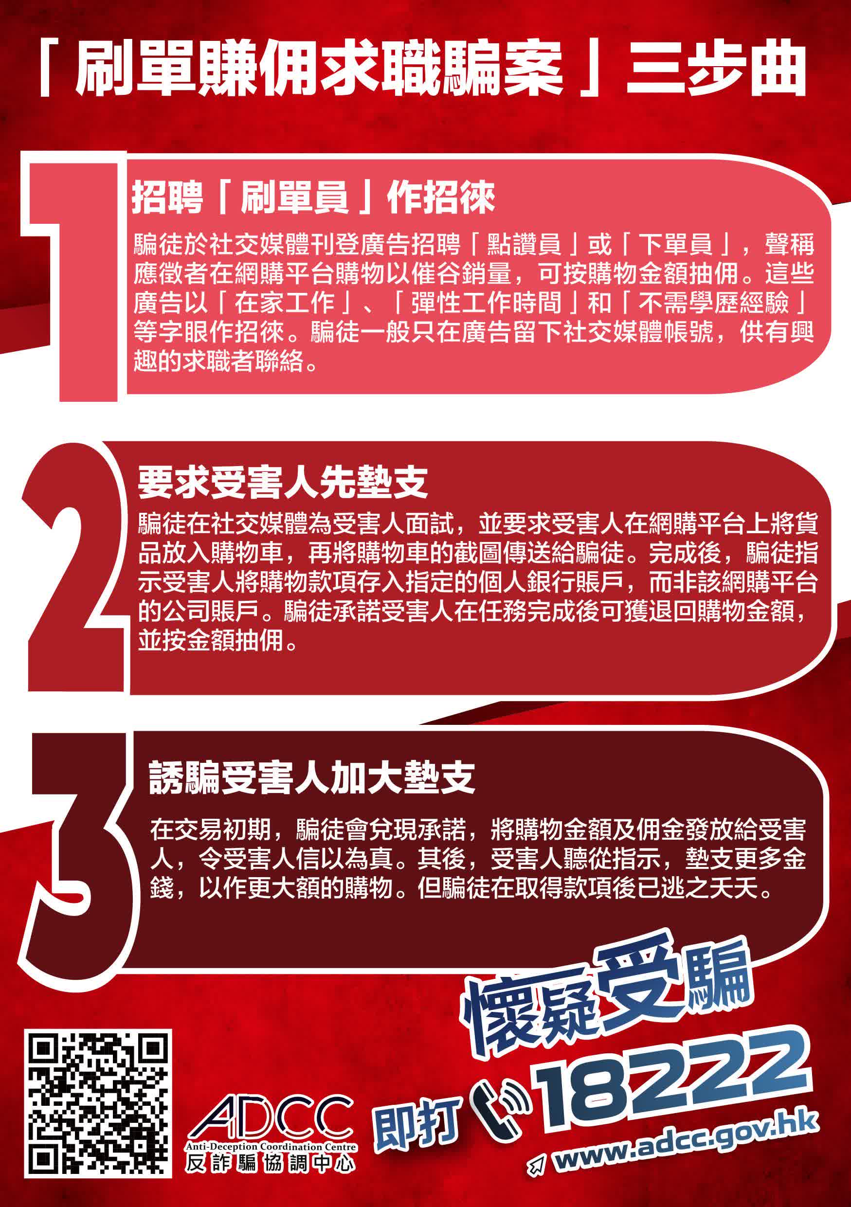 在刷單賺佣求職騙案中, 騙徒會利用「高薪厚職」、「無需經驗」、「彈性工作」等字眼作招徠,透過社交媒體發放招聘廣告, 聲稱只要在購物網站將貨品放入購物車截圖,然後將截圖發給騙徒,再將購物金額轉賬到騙徒提供的個人銀行賬戶,就可以賺取佣金並獲退回購物金額。在起初的交易,騙徒會兌現承諾……