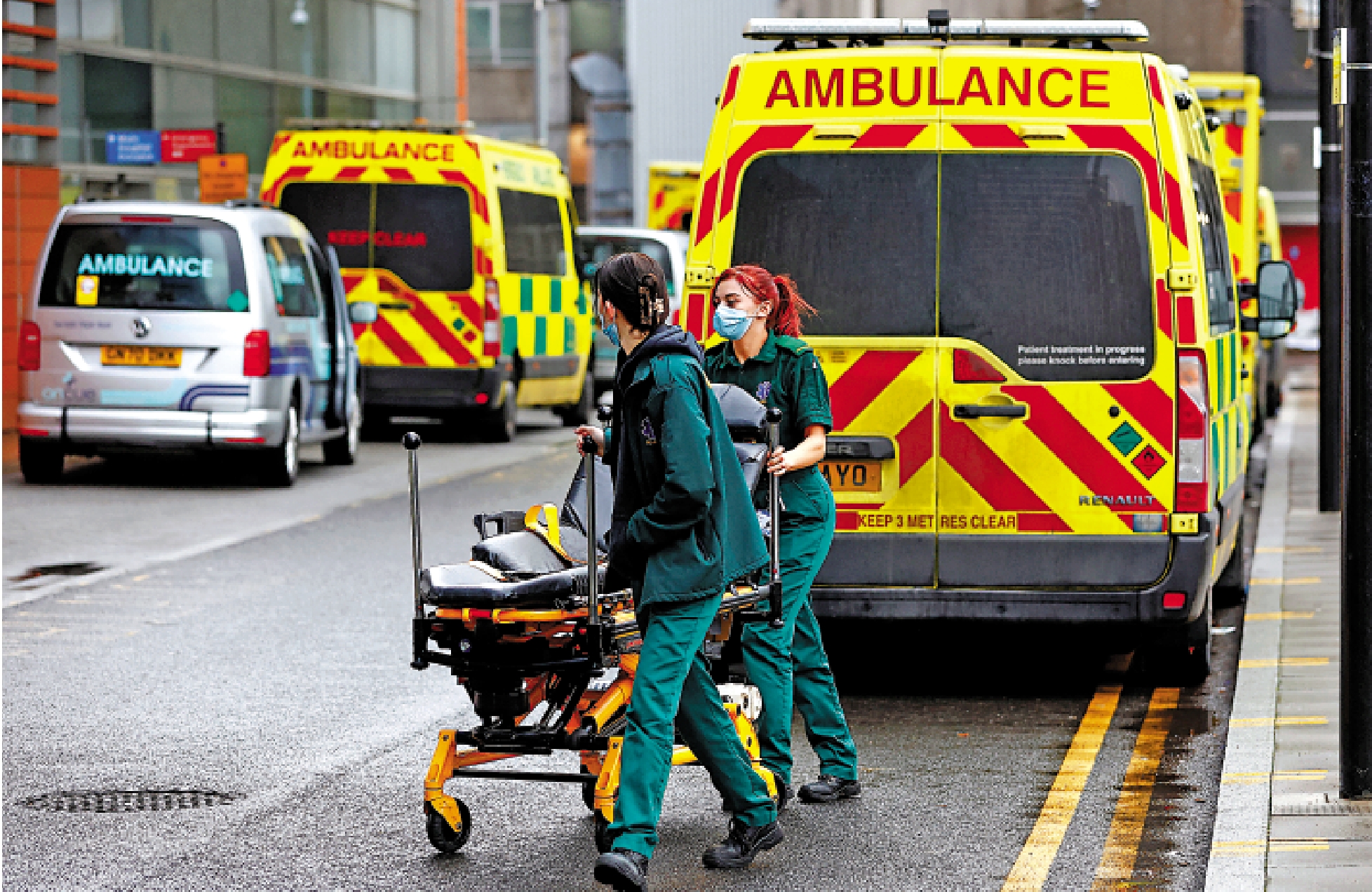 • 21日,英格蘭和威爾士大部分地區的救護車只會在接到第一類求救電話時出動,即患者出現心肺停止等直接危及生命的情況。面臨「非致命情況」,包括中風、胸痛的患者或需自行前往醫院。多地醫院表示,臨產孕婦也不一定能等到救護車。英媒拍到有人駕駛私家車送病人去醫院。