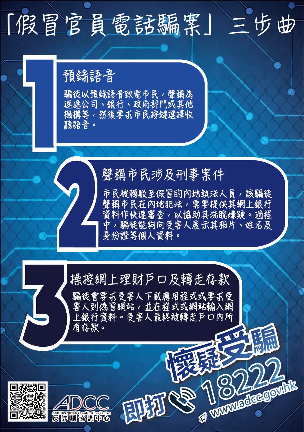 在假冒官員電話騙案中,騙徒假扮內地執法人員致電受害人,聲稱受害人在內地犯法,要求受害人支付金錢作保證金,或交出網上銀行賬戶號碼及密碼作調查之用,並會威脅受害人若拒絕合作,便會作出拘捕……