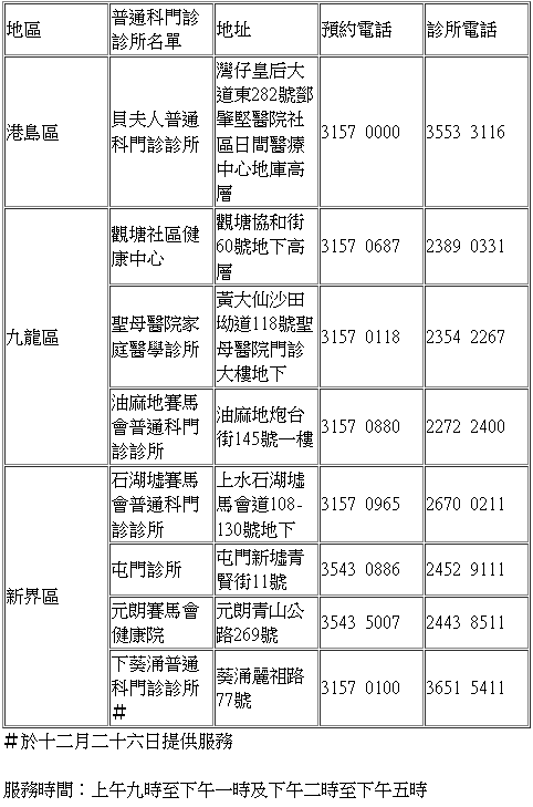 大公文匯全媒體報道,醫院管理局(醫管局)發言人今日(22日)公布,因應部分普通科門診診所已啟動為新冠肺炎確診個案指定診所,聖誕假期期間(12月26及27日)將有8間普通科門診診所提供公眾假期普通科門診服務(詳見下表)。求診人士可如平日般透過電話或「HA Go」流動應用程式內的「預約普通科門診」功能,預約診症時間。