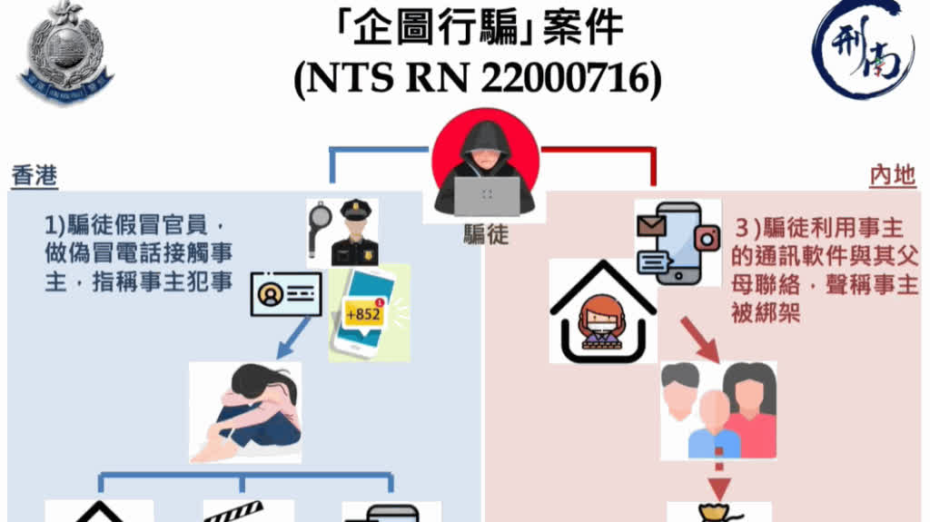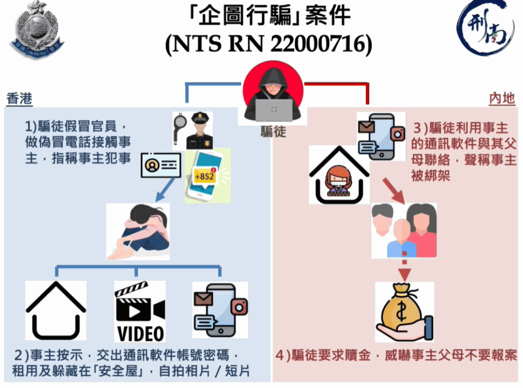 案情指,一名20歲內地來港的女大學生,於10月末收到假扮內地官員的騙徒來電,稱她涉及內地刑事案件,要求提供協助,否則會向她及其家人採取執法行動。事主根據騙徒指示,交出自己社交媒體賬戶及密碼,然後租用一個民宿單位作為「安全屋」,獨自躲藏在內,自拍一些相片及影片供「調查」用途。與此同時,騙徒利用女生的社交媒體賬戶與其在內地的父母聯絡,向他們發放女生的相片及影片,聲稱女生被綁架並要求贖金,父母於是透過在香港的朋友向警方報案求助。