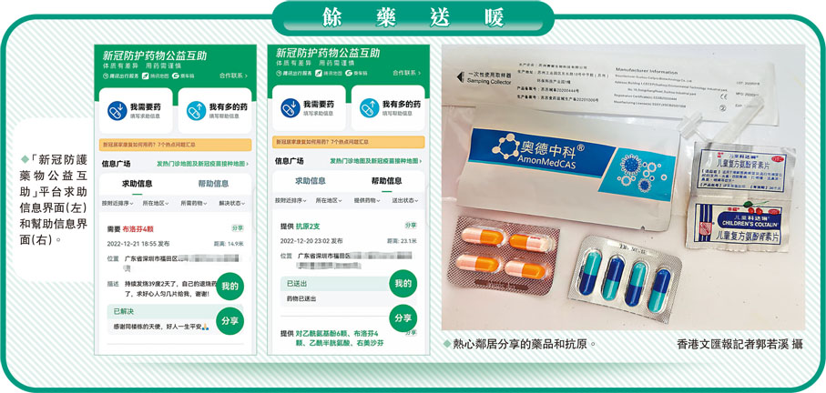 (香港文匯報 記者 郭若溪 深圳報道)「我需要對乙醯氨基酚」、「我需要布洛芬4顆、抗原2支」……12月21日,一個名為「新冠防護藥物公益互助」的微信小程序,在微信朋友圈裏廣泛傳播。不少內地民眾通過平台發布求助信息後,收到了鄰居提供的藥物幫助,也有民眾通過小程序把防疫物資轉給了真正需要的人,完成了一場又一場的愛心互助。 上線不到2日,已有超過百萬用戶來到互助頁面,截至22日上午,累計超過26萬條求助與幫助信息發布,其中求藥信息遠多於提供多餘藥物信息。有人說,自己在送藥的過程中聽到了「這輩子最多的謝謝」。