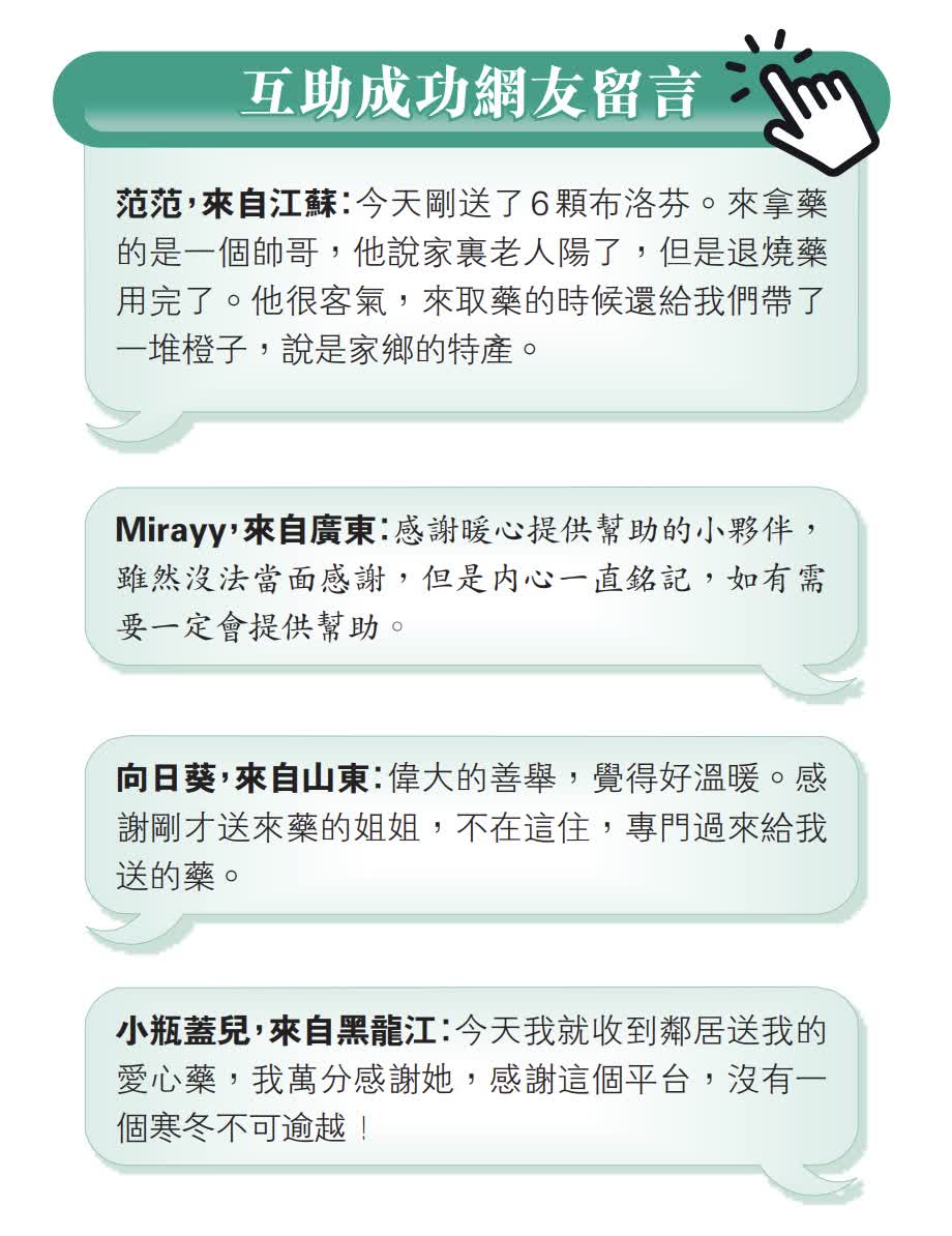 對於這樣的暖心行為,有過貼身體驗的康復者胡女士認為,這樣能更快地幫助到別人。「前段時間我們一家三口都陽了,找親戚朋友們每個人擠一點出來,所以非常理解急用時着急和痛苦的心情。我發燒了,我又找不到藥,這時,不管是誰給我一點點這種藥物,讓我沒那麼難受,就覺得很開心很暖心了。」胡女士直言,一藥難求的現狀下,能小範圍形成團體互助,真的很讚。「像抗原和退燒藥這類藥品,『楊康』後再大量用到的幾率並不大。再說了,就算有復陽的可能性,只要互助團一直存在,大家心裏就不慌了。」