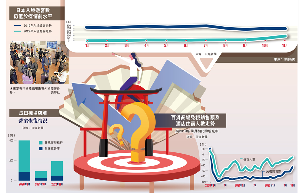 大公報綜合日經新聞、共同社報道,日本政府10月中全面放寬入境限制後,訪日外國人數量持續增加。日本國家旅遊局(JNTO)發布的最新數據顯示,11月訪日外國人數量為93.45萬,恢復至2019年同期的40%左右。旺盛的入境遊客消費刺激國內經濟,但酒店、餐飲等行業深陷勞動力短缺,旅遊業全面復甦面臨挑戰。