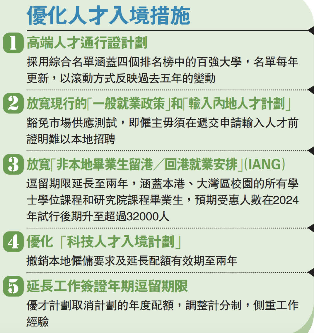 而四個大學排名榜中,過去五年曾上榜大學都計算在內,共有176間大學符合條件,9間來自內地,5間屬於本地院校,政府目前只會認可本科生。而非本地畢業生留港回港就業計劃,會擴至大灣區校園,安排適用於科大、中大和浸大。他更提及,現有人才計劃,可同時申請配偶和18歲以下未婚子女來港,當局亦優化簽證年期。