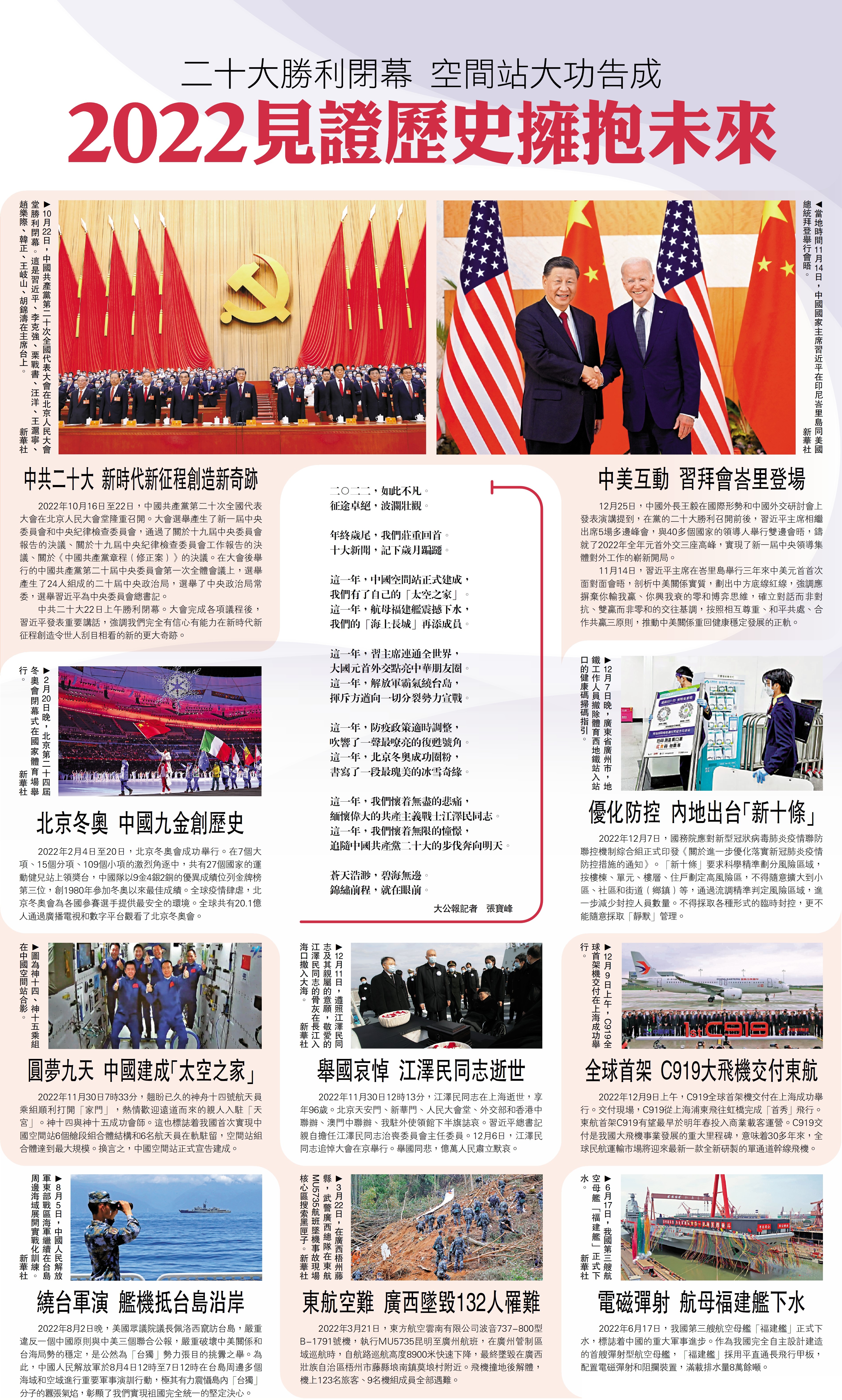 (大公報 記者 張寶峰)二○二二,如此不凡。征途卓絕,波瀾壯觀。年終歲尾,我們莊重回首。十大新聞,記下歲月蹁躚。