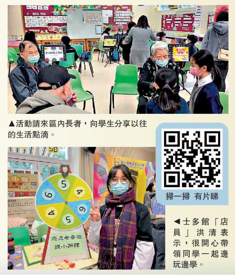 聖提摩太小學邀請了十名區內長者到校,向活動參加者分享昔日的食物、娛樂、居住環境等,同學與老人家更一起玩「挑竹籤」、「彈波子」、「翻花繩」等遊戲,其樂融融。長者「Mary姐」向幾名孩子分享了自己少女時期讀書、拚搏的故事,她表示,很高興有機會與同學談天,希望鼓勵同學要有夢想並勇於嘗試。