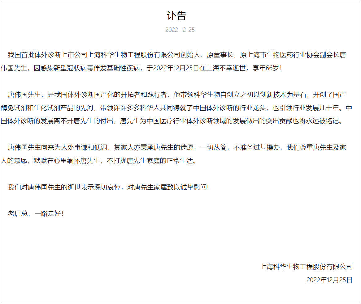 12月25日,體外診斷上市公司上海科華生物工程股份有限公司在公司官網發布訃告,公司創始人、原董事長,原上海市生物醫藥行業協會副會長唐偉國先生,因感染新型冠狀病毒伴發基礎性疾病,於2022年12月25日在上海不幸逝世,享年66歲。