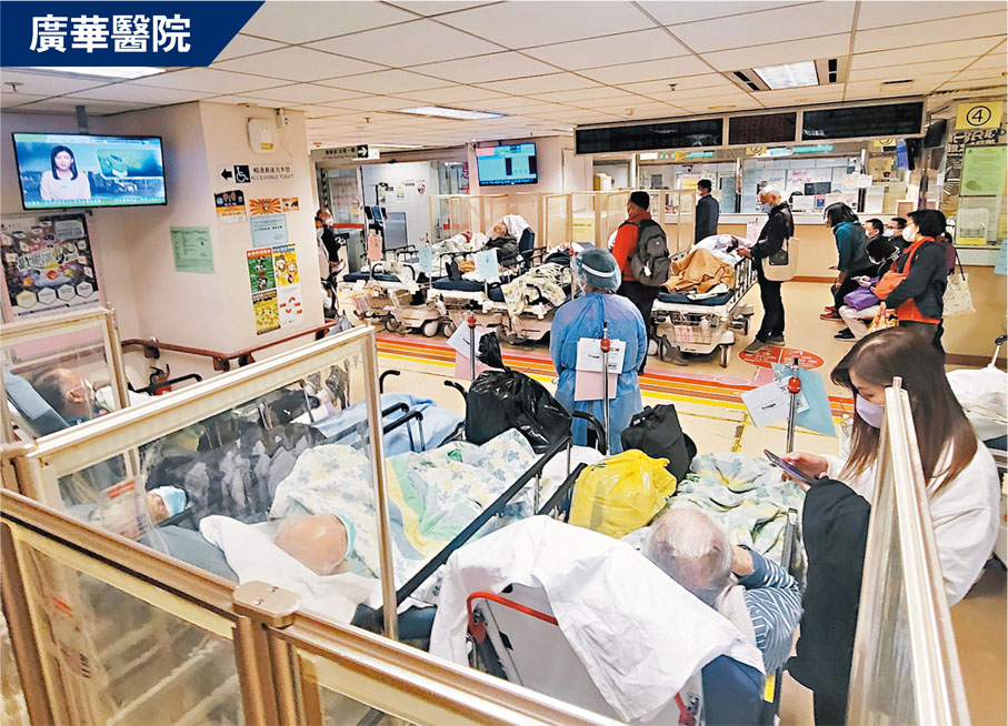 香港文匯報記者昨日來到廣華醫院急症室直擊,發現病人布滿整間急症室,座位坐滿病人,一張張病床緊挨着,僅留出一條小通道讓病床推出推入,病床上一些病人呼吸時有喘鳴聲,急症室外面亦坐着不少病人的家屬。急症室求診者以長者居多,醫護人員忙碌地收治病人,以及為新到的病人做病情評估,為受傷的病患做基本包紮等,等待叫號的病人數十人,平均每隔15分鐘叫號治療一名病人。