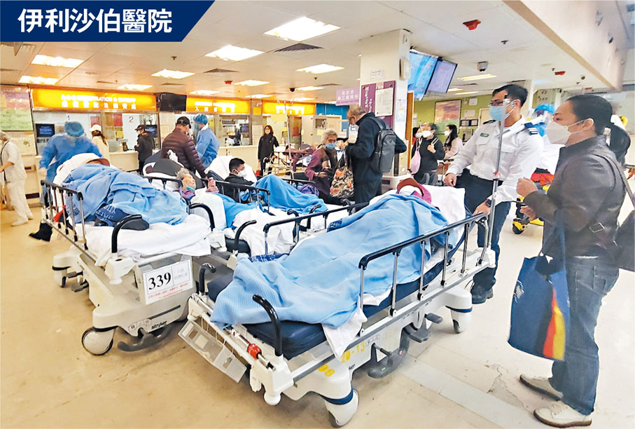 (香港文匯報記者 郭倩)聖誕節長假不少私家診所暫停應診,加上香港近日天氣持續寒冷,新冠及流感病毒夾擊,公立醫院急症室逼爆問題惡化,昨晨有一半公院急症室的輪候時間超過8小時。香港文匯報記者昨日直擊急症室擠滿病人,走廊擺滿輪椅和病床,部分病人由天黑等到天亮,醫護疲於奔命治療病人,人龍卻愈排愈長。有長者不慎摔破頭,血流不止,病情經分流評估為「緊急」,卻依然等近9小時仍未獲縫針;有長者氣促入院,通宵等治療,其兒子說:「假期其他醫院、私家診所都唔開,大家唯有湧來這裏。」