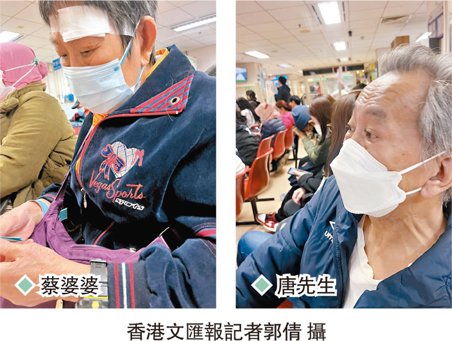 70多歲的蔡婆婆昨日早上起床後不慎滑倒,頭部撞到客廳的玻璃茶几血流不止,她便立即到廣華醫院取籌號輪候醫治。她說:「來到之後,護士幫我做過評估是『緊急』,但『緊急』都唔見得快幾多,其實假期我都預咗等久點,但沒想到這麼久,現在已經等咗近9個鐘,我個頭仲未縫到針,從早上到現在我一啲嘢都未食過。」