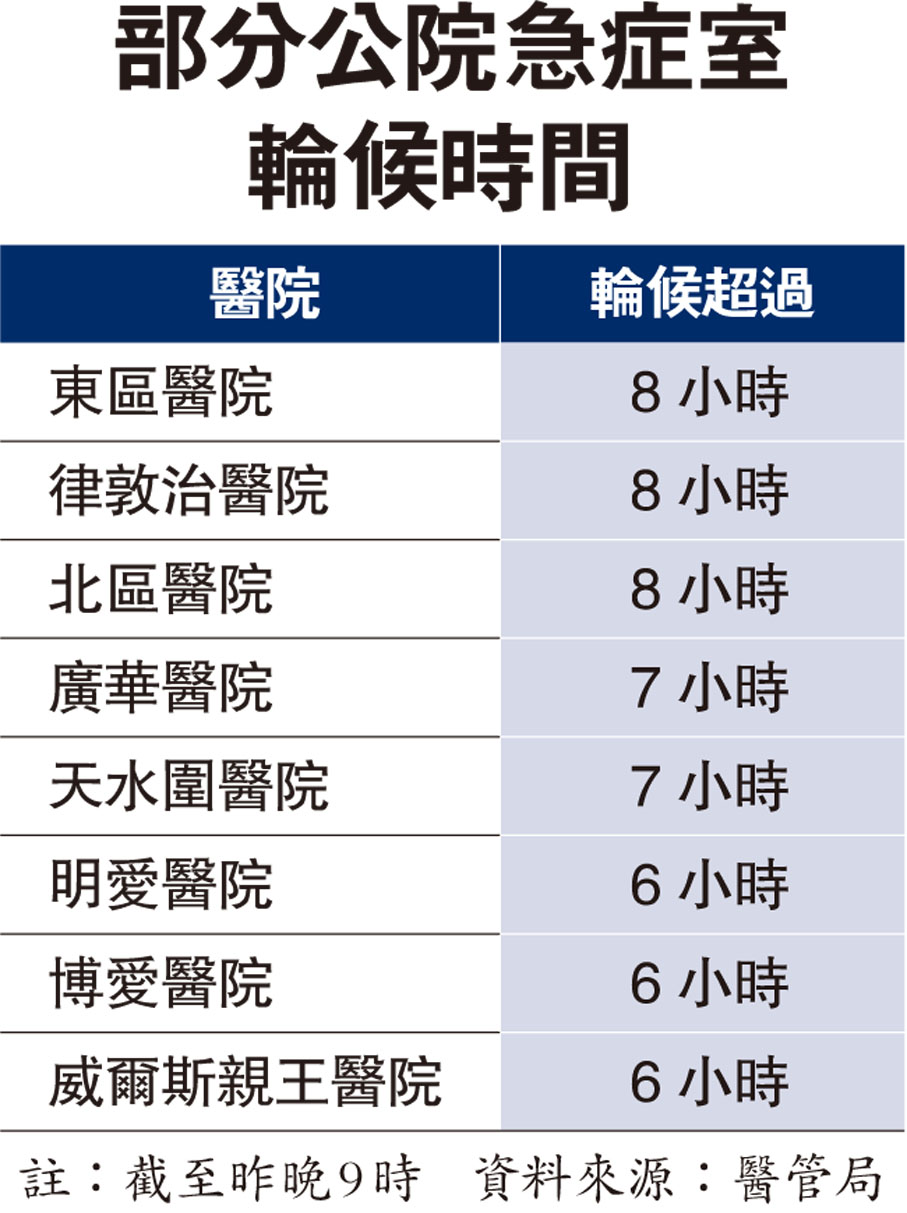 昨晨公院逼爆情況最嚴重,根據醫管局網頁,全港逾半公營醫院急症室患者輪候時間一度超過8小時,包括港島東區醫院、九龍廣華醫院和聯合醫院,新界北區醫院、瑪嘉烈醫院和天水圍醫院等。醫院內科病床整體住用率則為112%。