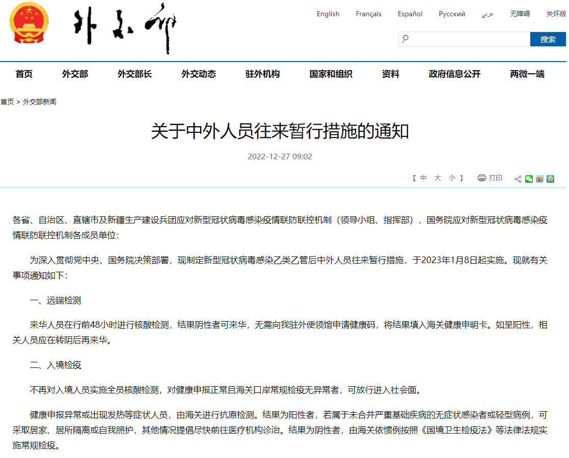 國務院聯防聯控機制昨晚發布《關於對新型冠狀病毒感染實施「乙類乙管」的總體方案》,提出2023年1月8日起取消入境後全員核酸檢測和集中隔離。外交部今日(27日)發布《關於中外人員往來暫行措施的通知》: