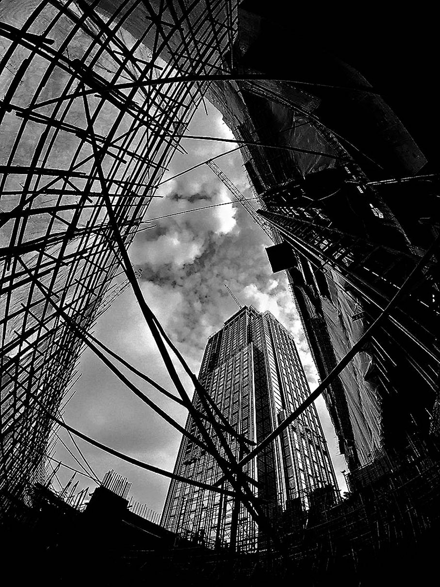 專注畫意攝影的董正綱,則以其獨特的黑白光影和與眾不同的視角,引導觀眾關注日常生活中常被忽略的事物。他的工作經常涉及尖沙咀的建築工程,10年間經常在地盤內走動,有時拍照,發現黑白效果下的地盤照片很特別:「地盤通常沒有明亮的燈光,但陽光強烈時,室內外有明顯光線對比,用黑白效果可以強調這種明暗對比。」他所拍攝的對象通常是人們所熟悉的建築物,如K11 Musea、香港太空館、中銀大廈、渣打銀行,也有拍下工作中見到的地盤工人,從水洼中拍的建築物倒影、建築玻璃幕牆的反射、透過窗簾看窗外的景象。在空間裏交叉相疊的建築物,構成一幅又一幅的剪影或幾何拼貼圖;在玻璃幕牆倒影中的樓宇,恍如大廈之間的對峙,在靜默之間是無言的對話。「作為建築師我很在意比例,照片在後製時會把線條拉得很直,很多時候普通人看建築是不會見到筆直的線條的,我想展現的就是一種平日裏我們用肉眼看不到的景象,以此讓觀眾的注意力回到建築本身。」