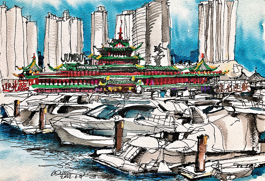 在旅行時,他也時常隨心將當地的風景與風情即場速寫在速寫本上,繪畫也成為了一種他與當地人溝通的方式,帶來無限探索樂趣。其作品也不限於山水和城市景觀,食物也是他經常入畫的題材,平日饕餮之餘,也快手畫下潮州凍蟹、金目鯛等美饌。「 我習慣了速寫,與同事討論設計時也會隨手畫出自己的想法,我想這是我可以畫得很快的原因。」他亦認為建築的設計與繪畫大不相同,完全是兩種思維,「建築設計主要是考驗創意和思路,繪畫對我而言是關心世界的方式,比設計更開心!」
