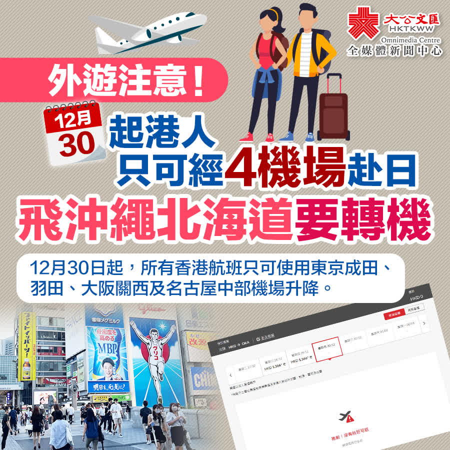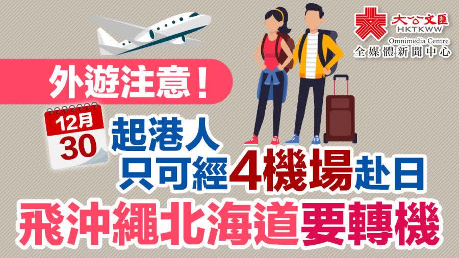 大公文匯全媒體報道,日本收緊防疫限制,首相岸田文雄今日(27日)宣布,自12月30日(星期五)起,所有來自中國內地、香港及澳門的航班,只可以使用4個機場升降,包括東京成田、東京羽田、大阪關西及名古屋中部機場。換言之,當日起將無直航班機,往來香港至沖繩、北海道札幌、九州等的港人熱門遊日目的地。
