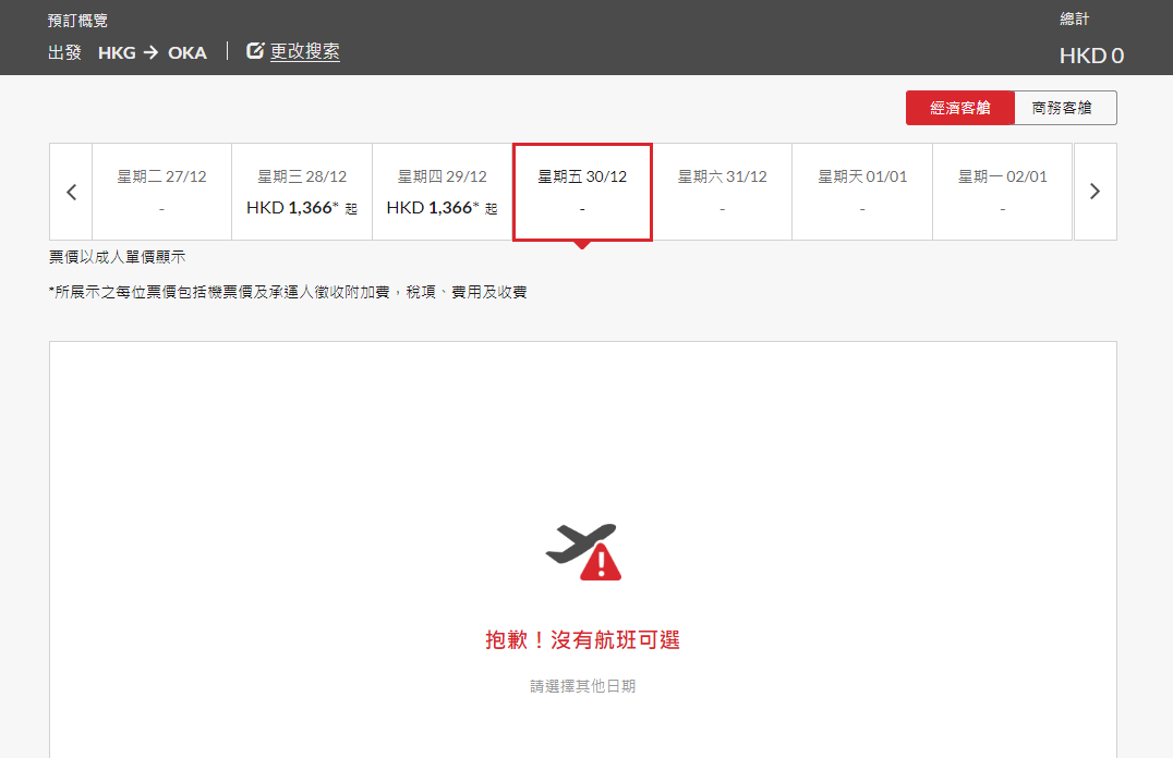 記者翻查香港各大航空公司網頁,發現香港航空仍能預訂明日及後日前往沖繩、北海道等地的航班,惟周五起則只能選擇由香港前往東京成田、羽田、大阪的航班。國泰航空網頁上,例如搜索香港前往福岡的航班,明後兩日仍有大量航班可供選擇;惟再查詢之後日期的航班,網頁則顯示「找到0個結果」。至於香港快運網頁,來往香港至日本沖繩、福岡等地的航班,周五起全部顯示「已客滿」,未能購買。