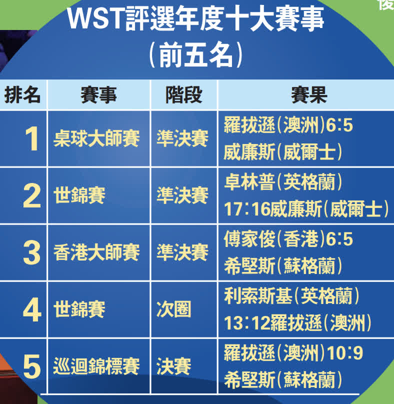 (大公報 記者 梁潤森)香港桌球名將傅家俊再次為港爭光,世界桌球巡迴賽官網(WST)昨天精選2022年十大賽事,傅家俊在10月香港大師賽4強決勝局打出147滿分,以局數6:5絕殺蘇格蘭名將希堅斯,這場就連傅家俊本人都表示是職業生涯最難忘的一仗,獲評選為年度第3精彩賽事,可說是實至名歸。年度最佳賽事為桌球大師賽準決賽澳洲名將羅拔遜6:5勝威爾士好手威廉斯一戰,威廉斯更可說是「名局製造者」,因為十大賽事中他就佔了其中一半。