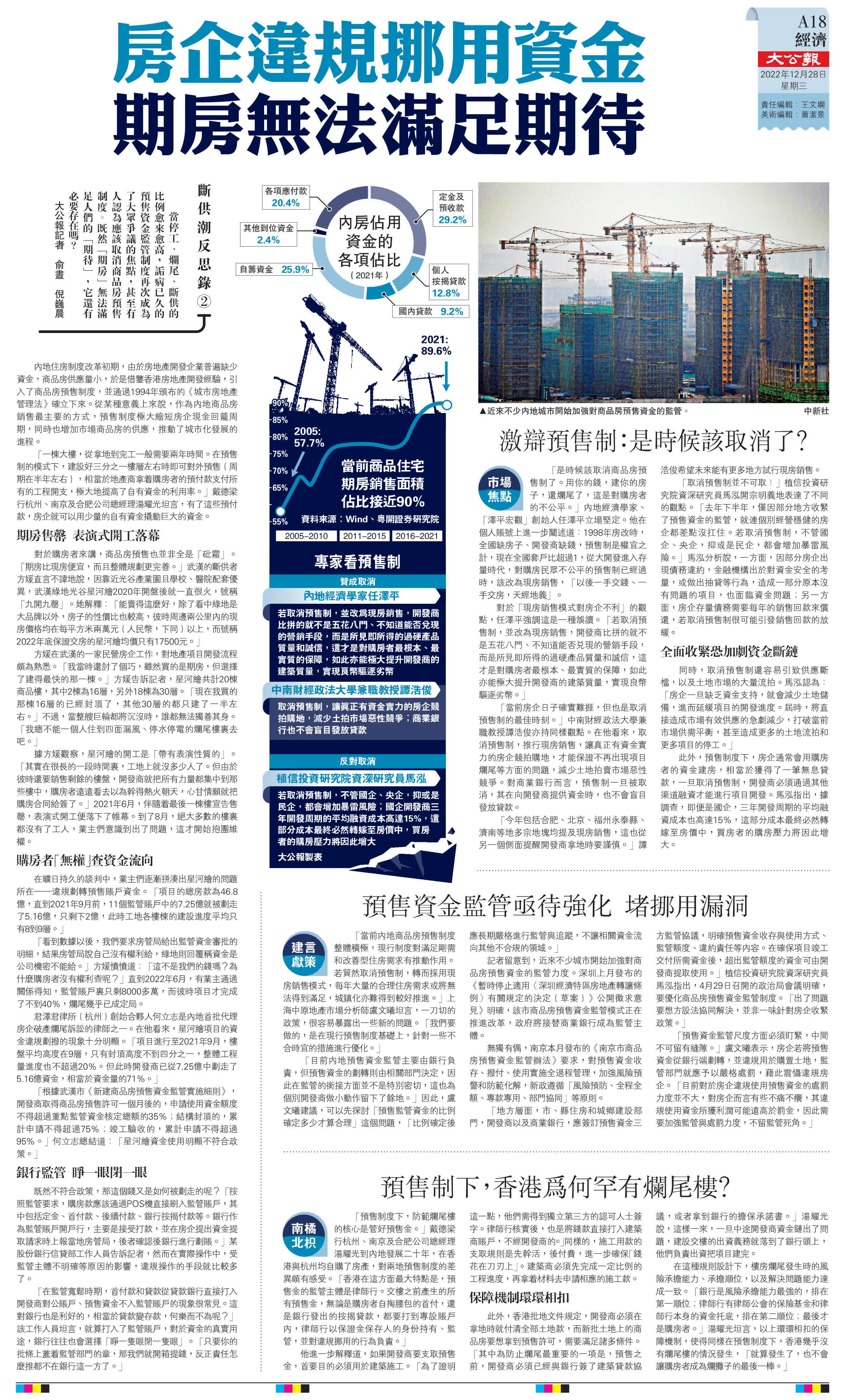 (大公報記者 俞晝 倪巍晨)當停工、爛尾、斷供的比例愈來愈高,詬病已久的預售資金監管制度再次成為了大眾爭議的焦點,甚至有人認為應該取消商品房預售制度。既然「期房」無法滿足人們的「期待」,它還有必要存在嗎?