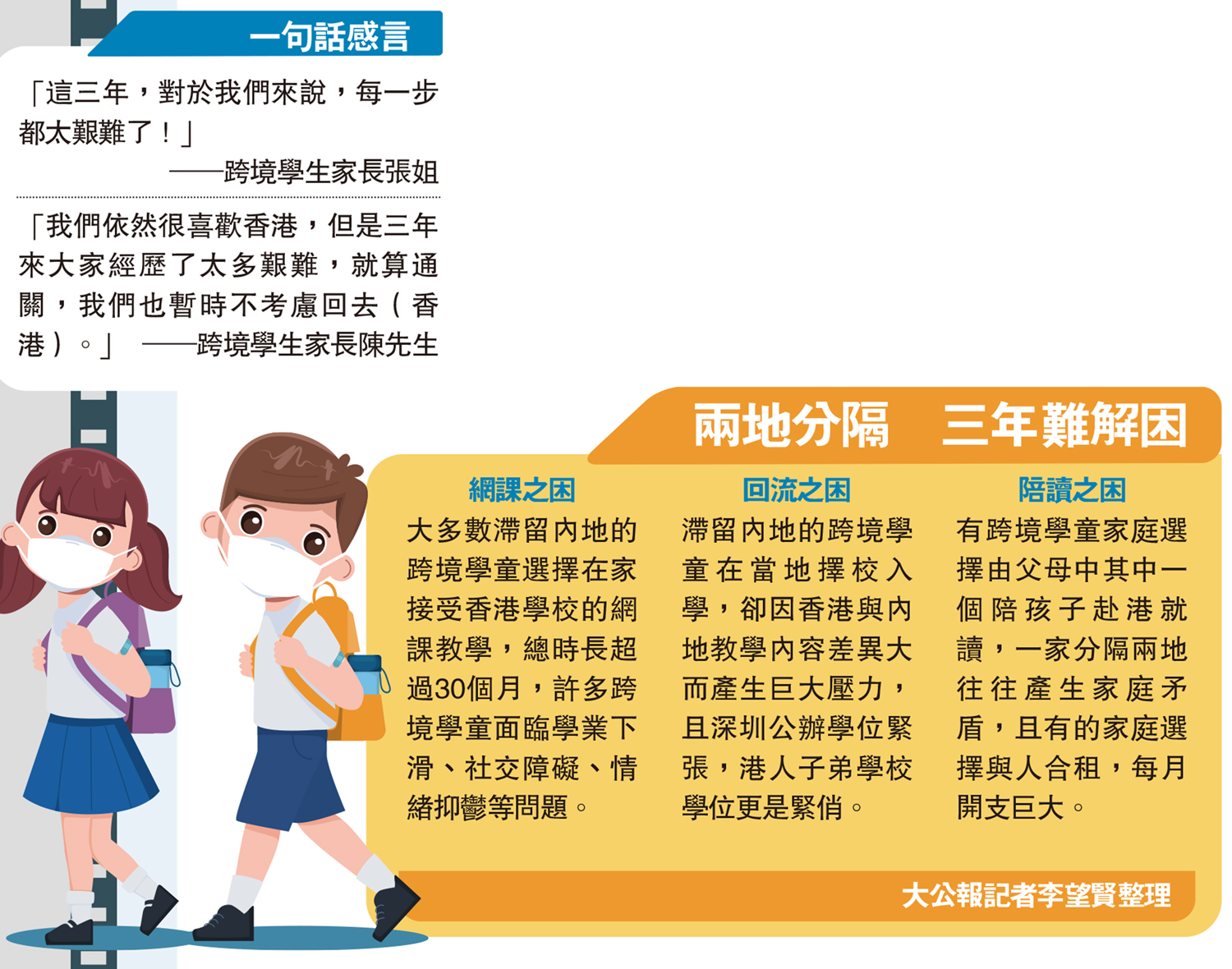 (大公報記者 李望賢)三年疫情阻隔,通關終於有期。「她很雀躍地跟我討論回家要買多大的行李箱,才能裝下這麼多的行李。」深港跨境學童家長張姐提及與獨自在香港求學的女兒小天視頻聊天,激動不已。過去的一千多天對跨境學童家庭而言漫長又沉重。曾經,得益於深港雙城緊密聯動,數萬跨境學童每日往返於深港口岸之間。三年來,孩子們穿梭兩地的學習生活節奏被打破,長時間網課導致成績下降,甚至出現心理問題。不少孩子轉而在深圳擇校,或獨自返港求學,他們對未來的期許也不復從前。通關在即,不少家庭感嘆,希望跨境學童群體能夠盡早回到昔日正常的學習和生活軌道。
