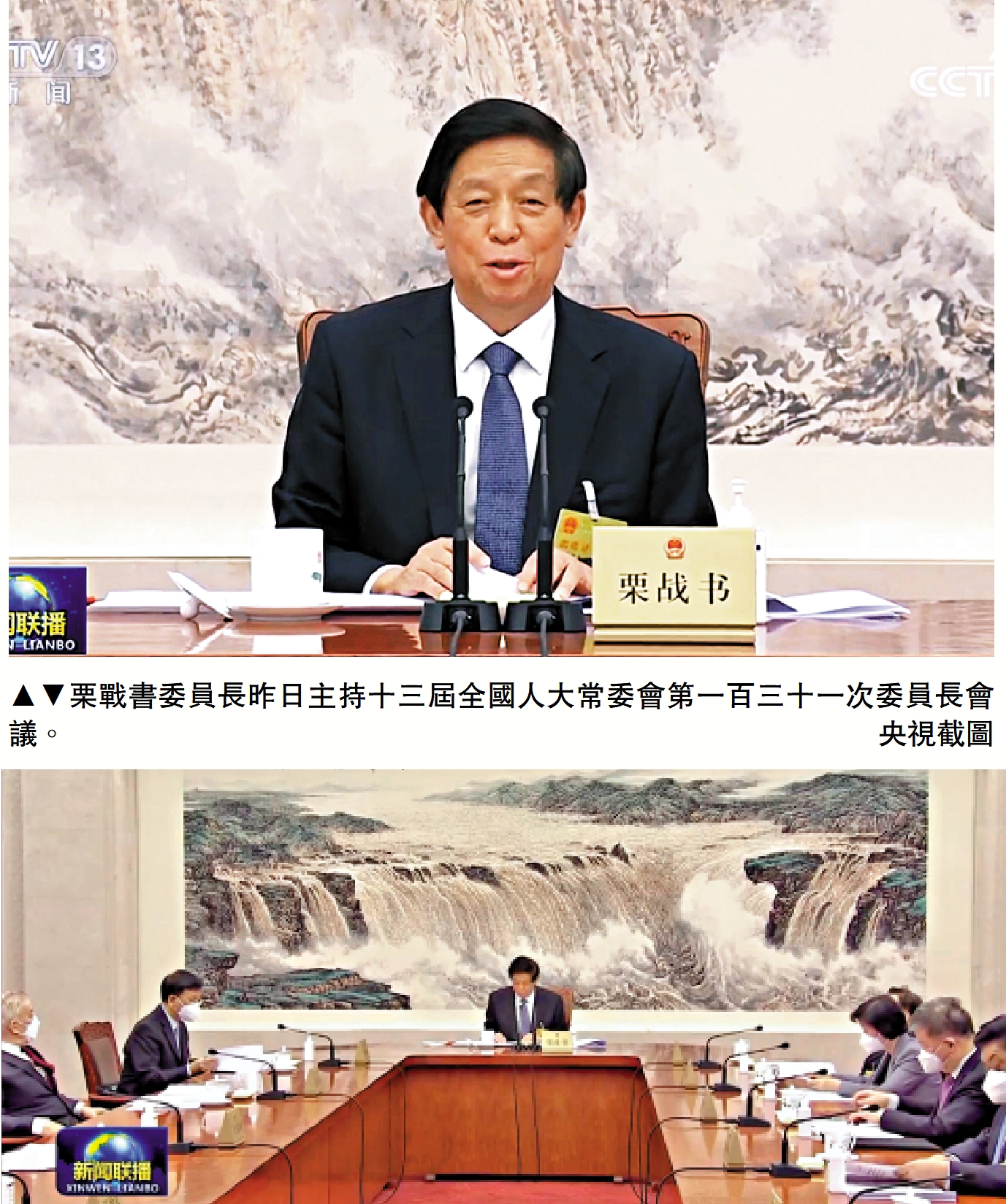 大公報記者 龔學鳴綜合新華社報道:十三屆全國人大常委會第一百三十一次委員長會議29日下午在北京人民大會堂舉行。栗戰書委員長主持會議。會議聽取了全國人大憲法和法律委員會主任委員李飛作的關於香港特別行政區維護國家安全法釋法案文建議稿審議結果的報告,審議了相關議案代擬稿、草案修改稿、決定草案、解釋草案等。會議決定,將上述議案代擬稿、草案修改稿、決定草案、解釋草案等,提交常委會會議審議。
