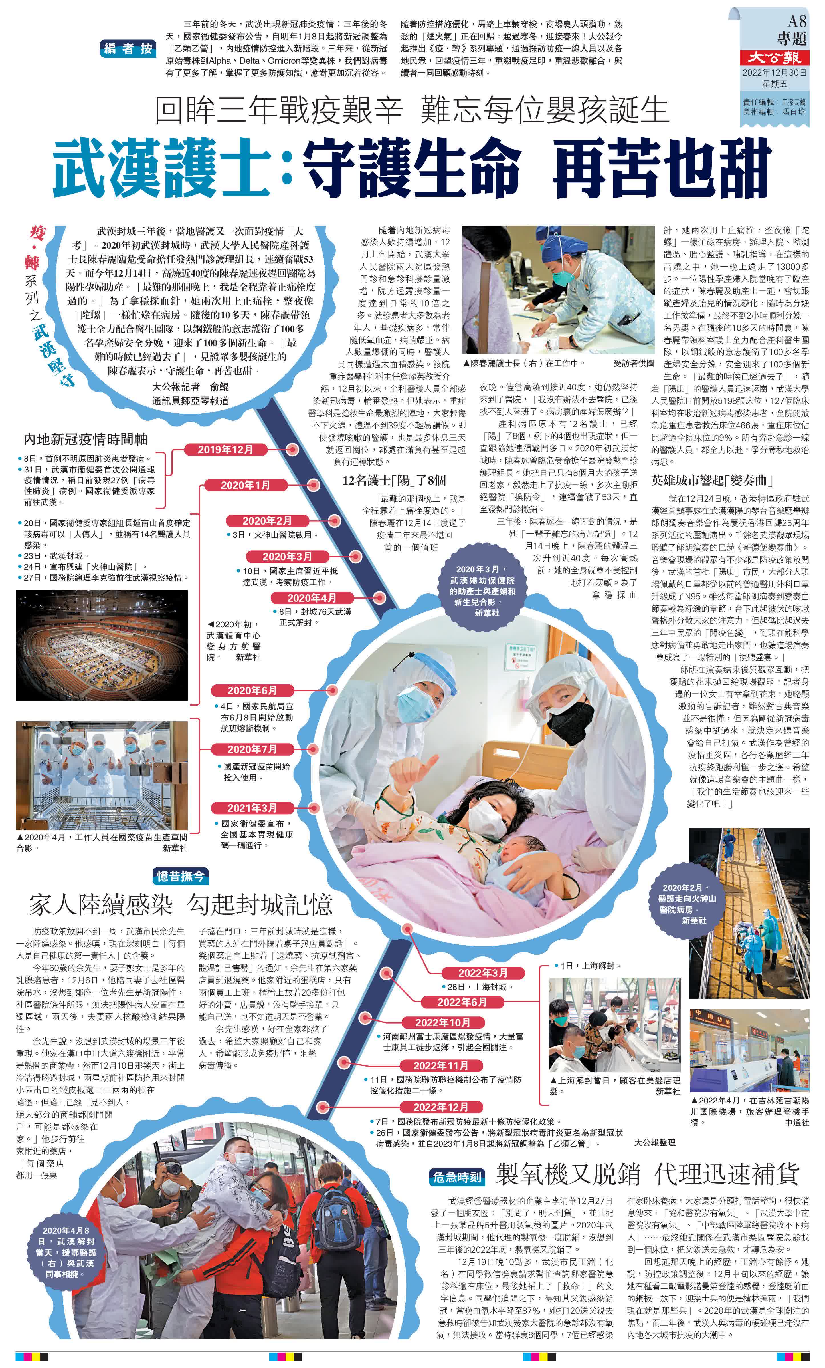 (大公報記者俞鯤 通訊員鄒亞琴 報道)三年前的冬天,武漢出現新冠肺炎疫情;三年後的冬天,國家衞健委發布公告,自明年1月8日起將新冠調整為「乙類乙管」,內地疫情防控進入新階段。三年來,從新冠原始毒株到Alpha、Delta、Omicron等變異株,我們對病毒有了更多了解,掌握了更多防護知識,應對更加沉着從容。隨着防控措施優化,馬路上車輛穿梭,商場裏人頭攢動,熟悉的「煙火氣」正在回歸。越過寒冬,迎接春來!大公報今起推出《疫·轉》系列專題,通過採訪防疫一線人員以及各地民眾,回望疫情三年,重溯戰疫足印,重溫悲歡離合,與讀者一同回顧感動時刻。