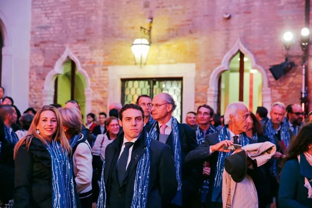 四個月的展期,威尼斯處處都散落着韓美林巡展的印痕,歌劇院、教堂、學校、書店、貢多拉,甚至是冰激凌店都能看到「韓美林全球巡展·美林世界在威尼斯」的海報,到處都充斥着—「IamHanMeilin」道旗。展覽期間,有兩位尊貴的嘉賓專程從巴黎和米蘭趕到展覽現場,至今令我們難忘。