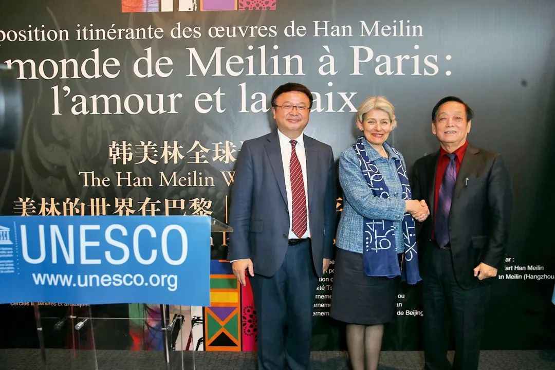 當天下午,時任聯合國教科文總幹事伊琳娜·博科娃風塵僕僕從國外趕回巴黎。看了展覽後對「韓美林全球巡展」第三站來到巴黎聯合國教科文組織總部表示熱烈歡迎,並對韓美林以「愛與和平」為主題而展出的作品讚不絕口,多次用中文說:「非常美!」