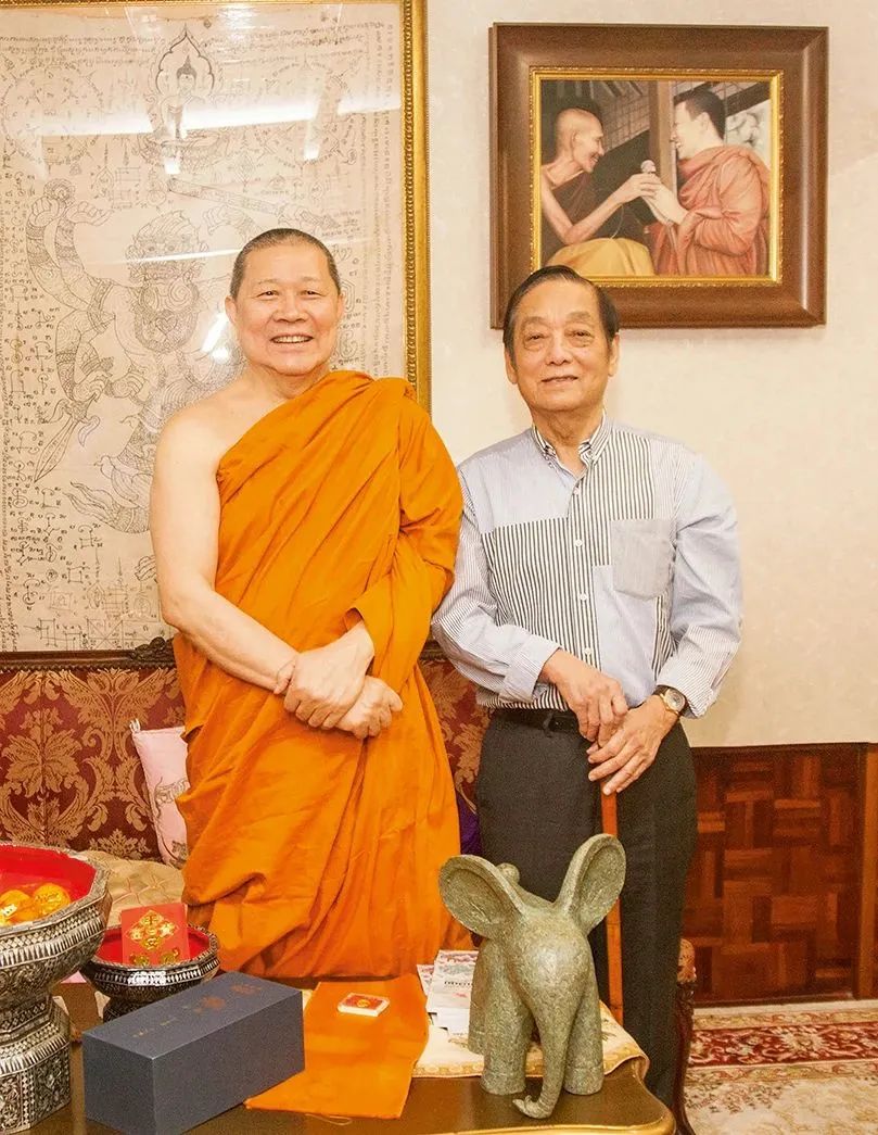 美林一生與佛有緣,這次與僧王亦是一見如故。副僧王請徒弟拿來了泰國佛教文化中的一尊「象神」送給我們。他說大象無論在泰國還是中國都是吉祥的象徵,最近武漢的新型冠狀病毒感染的肺炎疫情防控牽動全世界的心,用吉祥的「象神」祈禱中泰兩國人民都能獲得平安吉祥。韓美林也拿出了自己為金佛寺專門準備的雕塑作品,巧的是,也是一尊小象。副僧王頌德通猜看到後驚喜萬分,不停用手撫摸着小象的耳朵。他的徒弟說從來沒有見過師父如此喜愛一件藝術品。更讓他所有徒弟沒想到的是,會見到最後階段時,副僧王拿出了自己的加持手杖,向韓美林介紹說,這是他師父傳給他的,已有百年歷史。是一根由純實心的竹子打造,刻有四面佛、經文的手杖,是師父和自己最為珍愛的信物。今天與美林有佛緣,決定將手杖贈予美林,不是認為美林年紀大需要手杖,而是祝福美林吉祥如意、平安喜樂。美林接過手杖,動情地說,這幾天身在泰國,心系疫情中的中國,祈願天下眾生轉危為安。