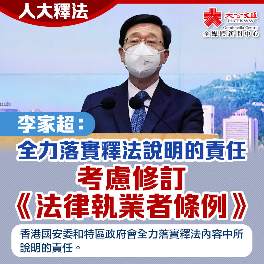 大公文匯全媒體記者報道,十三屆全國人大常委會第三十八次會議今日(30日)表決通過了《全國人民代表大會常務委員會關於〈中華人民共和國香港特別行政區維護國家安全法〉第十四條和第四十七條的解釋》。行政長官李家超晚上會見傳媒時表示,香港國安委和特區政府會全力落實釋法內容中所說明的責任,包括積極考慮就《法律執業者條例》提出修訂,強化維護國家安全制度保障。