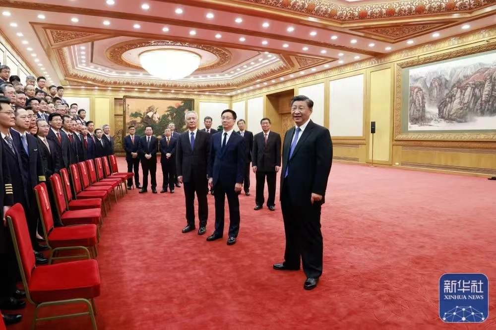 9月30日上午,中共中央總書記、國家主席、中央軍委主席習近平在北京人民大會堂會見C919大型客機項目團隊代表並參觀項目成果展覽,充分肯定C919大型客機研製任務取得的階段性成就。他強調,讓中國大飛機翱翔藍天,承載着國家意志、民族夢想、人民期盼,要充分發揮新型舉國體制優勢,堅持安全第一、質量第一,一以貫之、善始善終、久久為功,在關鍵核心技術攻關上取得更大突破,加快規模化和系列化發展,扎實推進製造強國建設,為全面建設社會主義現代化國家、實現中華民族偉大復興的中國夢不懈奮鬥。習近平同大家親切交流併合影留念後,來到人民大會堂河北廳,參觀C919大型客機項目成果展覽,聽取大型客機設計、製造、試驗、試飛、適航等有關方面的介紹。