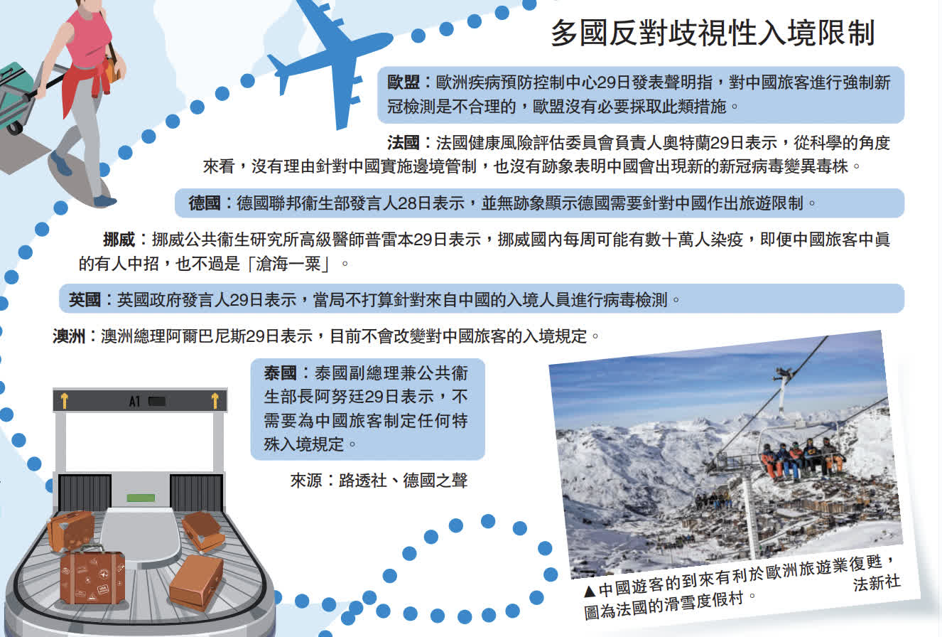 •約翰霍普金斯大學衞生安全中心高級研究員阿達利亞指出,目前美國本土疫情依然嚴峻,新的入境限制措施難有效果。歐盟指出,目前中國境內流行的並非新變種。意大利29日亦承認,沒有在來自中國的旅客身上發現新變種。