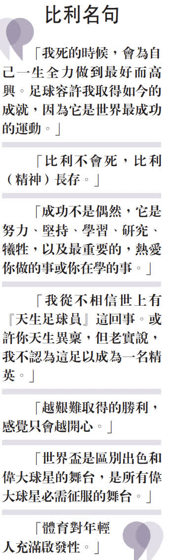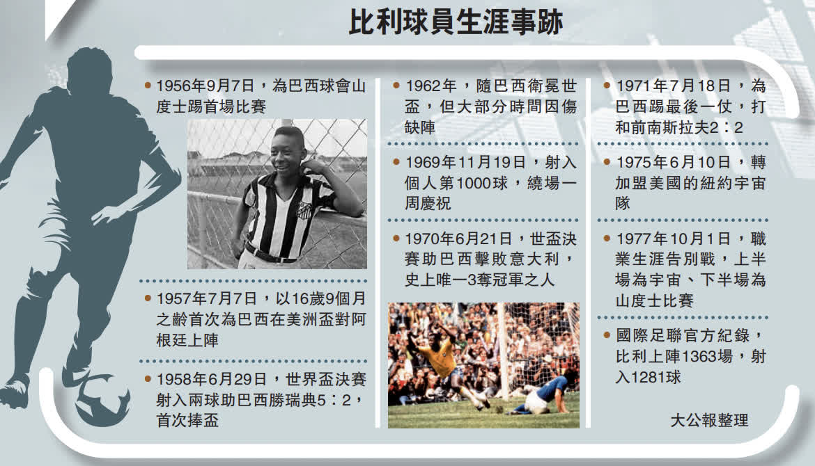 (大公報記者 黃智佳、譚德龍)比利之所以成為「球王」,帶領巴西成為歷史唯一能3摘世界盃無疑是重要成就。同時,樣樣皆能的「黑珍珠」球場上發揮隨心所欲,將賽事昇華至藝術層次,更加是前無古人,為「森巴軍團」樹立「美麗比賽」(O Jogo Bonito)風格,風靡全球。