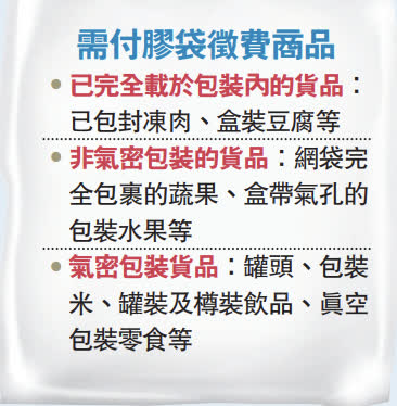 在超市內,以往能索取免費平口袋的水果、蔬菜區,已張貼徵費調整提示。不少市民都自覺自備購物袋,「其實調整徵費是好的,為環保出一分力,只是買東西時多帶一個袋,不是大問題。」到超市買雞蛋及水果的施女士表示,以往購物時有領取免費的平口袋,但在新措施實施前,已開始自備環保袋出門,認為沒有造成不便。
