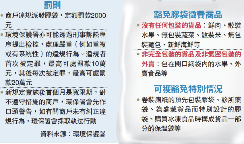 膠袋徵費每個五毫在本港已實施13年,昨日起加至一元,並取消現時對盛載冰凍或冷凍食品的塑膠購物袋的豁免。新措施下,市民購買散裝或未密封的食物時,可於每單消費限取一個免費膠袋。大公報記者昨日在旺角、香港仔區實地觀察,街市檔販普遍沒有為已包裝食品提供額外膠袋。
