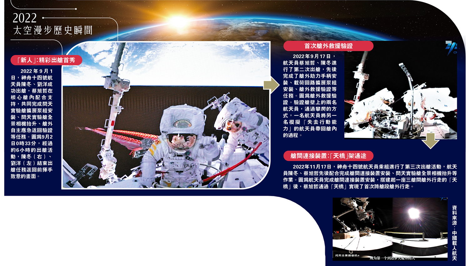 2022年是中國空間站建設的關鍵一年。神舟十三號乘組返回地面,神舟十四號乘組升空,問天艙、夢天艙先後發射,神舟十五號乘組與神舟十四號乘組完成「太空會師」……重近百噸的中國空間站正在400公里的太空軌道上守望着地球,承載着空間科學夢想的國家級平台已經啟航。
