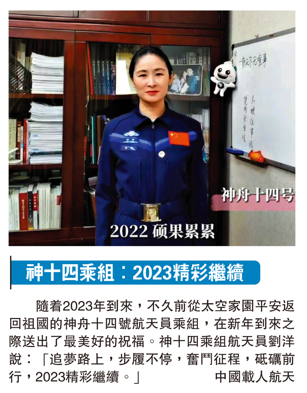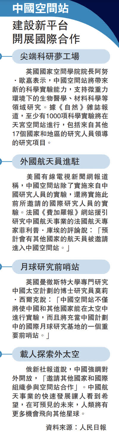 (大公報記者 劉凝哲、凱雷)2022年,中國空間站完成三個艙段「T」字型結構的在軌建造,國家太空實驗室已經成型。中國空間站不僅是中國人的太空之家,更向世界敞開大門。目前,多國已提出選派航天員參與中國空間站飛行任務的需求,中方也正開展對接協調。此外,中國與聯合國外空司、歐洲空間局共同遴選的多個空間科學應用項目正按計劃實施,相關載荷將於2023年開始陸續進入中國空間站開展實驗。據外媒報道,至少有1000項科學實驗將在天宮空間站進行,包括來自其他17個國家和地區的研究人員領導的研究項目,並預計會有其他國家的航天員獲邀請進入中國空間站。