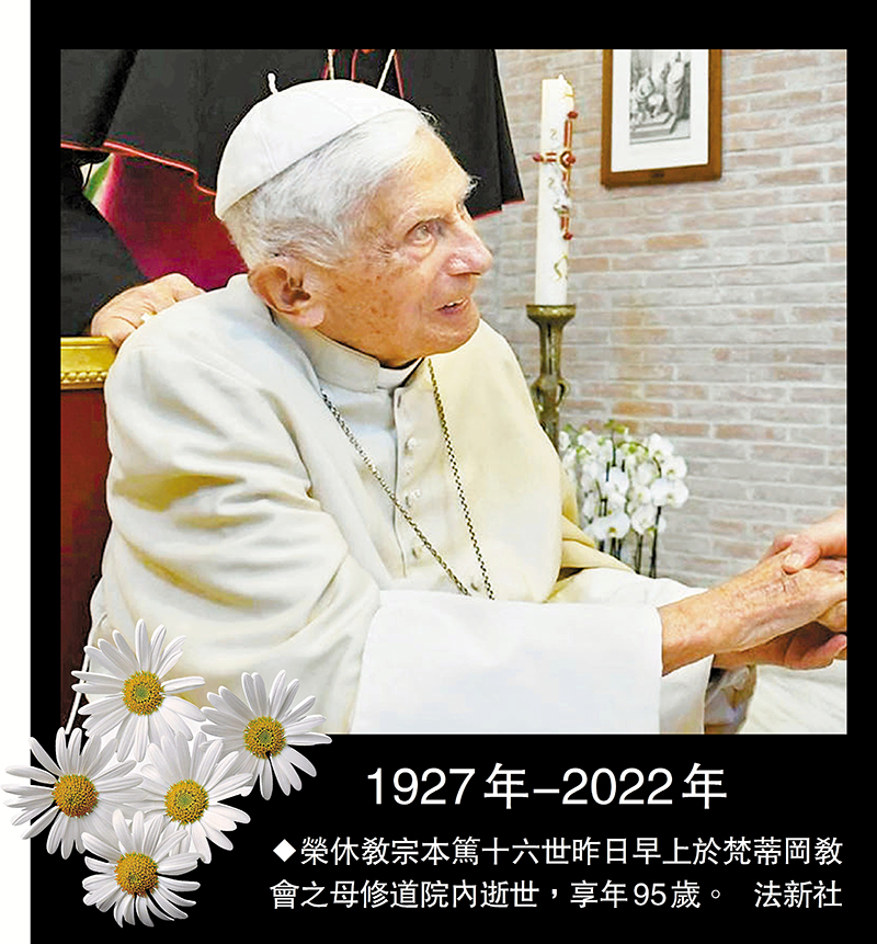 香港文匯報綜合報道:梵蒂岡宣布,榮休教宗本篤十六世昨日早上於梵蒂岡教會之母修道院內逝世,享年95歲。據梵蒂岡發布的聲明稱,榮休教宗的遺體將由明日起停放於聖伯多祿大教堂供信眾瞻仰,葬禮將於本月5日舉行。本篤十六世於2013年突然宣布辭職,成為600年來首位在世時退位的教宗,之後一直住在梵蒂岡。教宗方濟各日前透露本篤十六世病重,身體非常虛弱,呼籲信眾為對方祈禱。