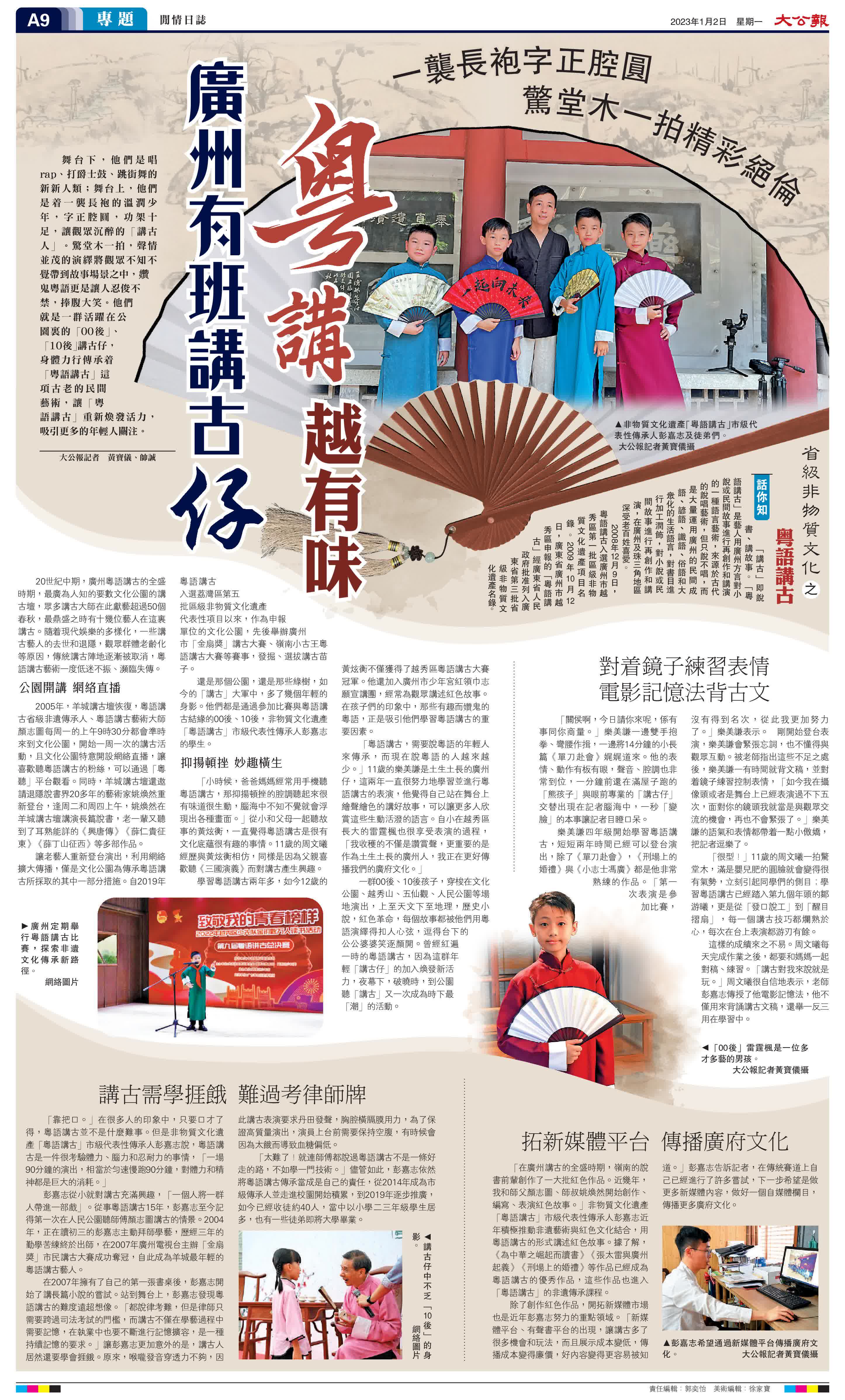 (大公報 記者 黃寶儀、帥誠)舞台下,他們是唱rap、打爵士鼓、跳街舞的新新人類;舞台上,他們是着一襲長袍的溫潤少年,字正腔圓,功架十足,讓觀眾沉醉的「講古人」。驚堂木一拍,聲情並茂的演繹將觀眾不知不覺帶到故事場景之中,㜺鬼粵語更是讓人忍俊不禁,捧腹大笑。他們就是一群活躍在公園裏的「00後」、「10後」講古仔,身體力行傳承着「粵語講古」這項古老的民間藝術,讓「粵語講古」重新煥發活力,吸引更多的年輕人關注。