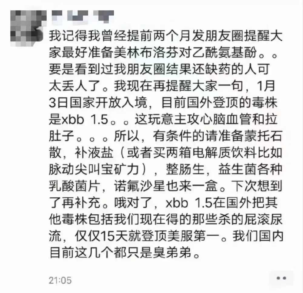 近日,一則有關XBB.1.5的朋友圈截圖在內地瘋傳,有關網友聲稱Omicron新變種病毒XBB.1.5「主攻心腦血管和拉肚子」,並將其他毒株「殺的屁滾尿流,僅僅15天就登頂美服第一」,他鼓動「有條件的請準備蒙拖石散(蒙脫石散)、補鹽液(或者買兩箱電解質飲料比如脈動尖叫寶礦力),整腸生,益生菌各種乳酸菌片」以及「諾氟沙星也來一盒」。