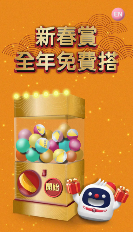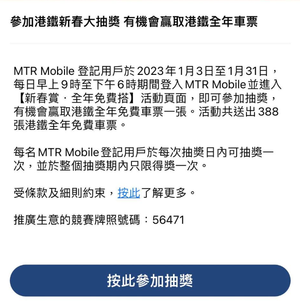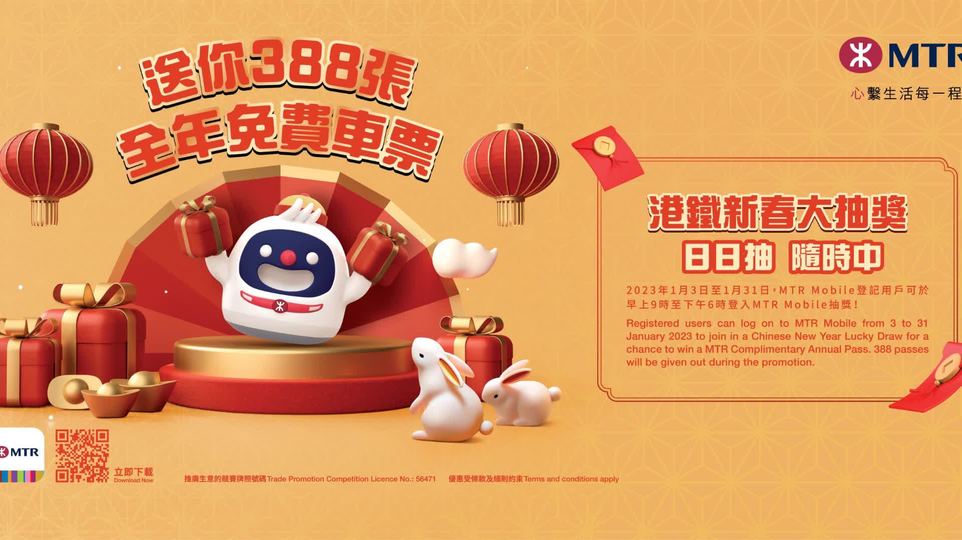 大公文匯全媒體報道,癸卯兔年即將來臨,港鐵「新春賞·全年免費搭」送出388張港鐵全年免費車票。由今日起至1月31日,每日早上9時至下午6時期間登入港鐵流動應用程式「MTR Mobile」並進入活動頁面即可參加抽獎!抽獎結果即時可知,每日可抽獎1次!