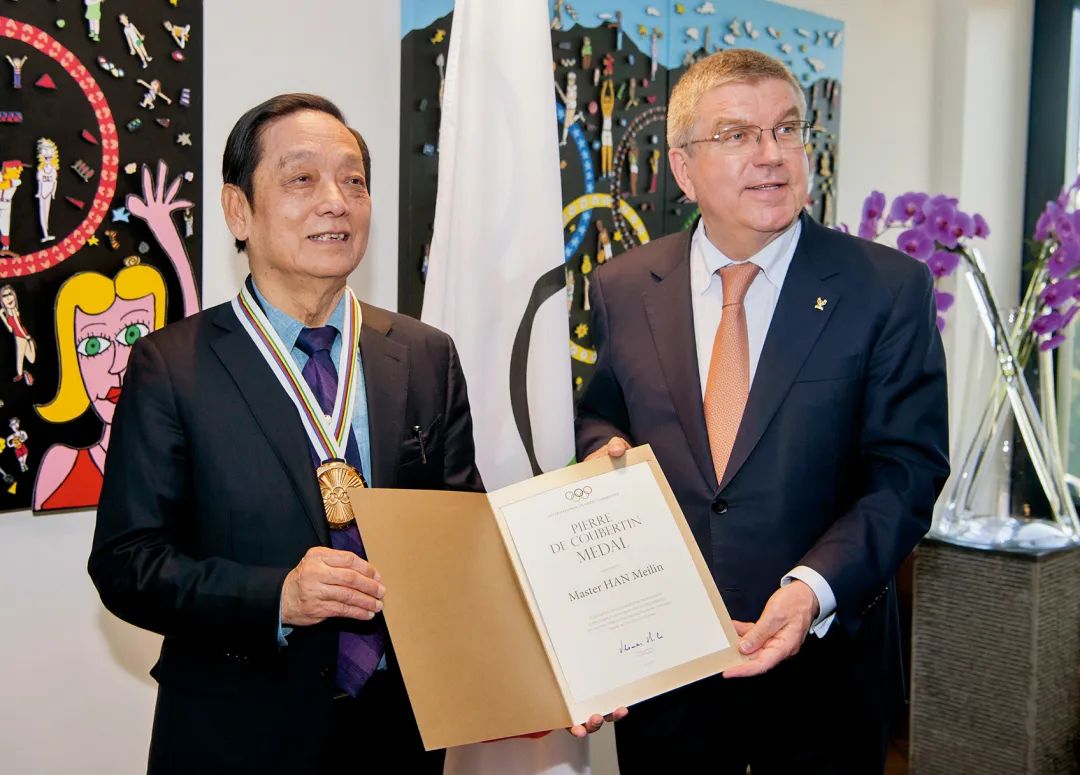 「顧拜旦獎」是國際奧委會頒發給為奧林匹克運動做出突出貢獻的人士。它與奧運獎牌不同,除了有特殊表現的運動員,那些為推廣奧林匹克運動和傳承奧林匹克運動精神有着突出貢獻的人士也是受嘉獎的對象。在頒獎儀式上,巴赫主席動情地說:「韓美林先生是奧運精神卓越的實踐者,是奧林匹克鮮活的象徵。」