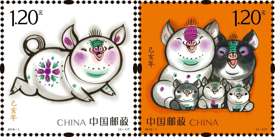 《己亥年》郵票一套兩枚,郵票第一圖名為「肥豬旺福」,肥豬肚藏乾坤,憨態可掬,以奔跑的動態表現靈動生風的喜感,象徵着正在奔向美好的生活;第二圖名為「五福齊聚」,是首次在一枚生肖郵票中完整體現「全家福」的概念,兩隻大豬和三隻小豬同時出鏡,其樂融融,寄託新春佳節闔家團圓、五福臨門的美好祝福。